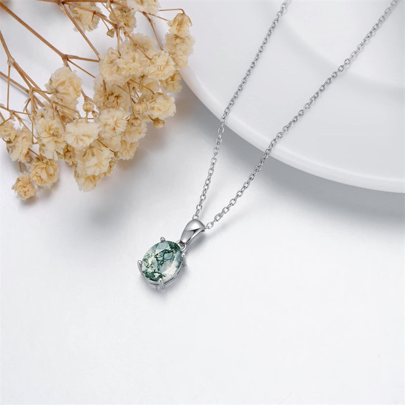 Moss Agate Necklace The natural moss agate necklace is designed for women and it can heal your heart very well. The simplicity of the design give the moss agate necklace a more delicate look. This single oval-cut moss agate necklace can easily handle your outfit, it can be a great gift for mom or a great gift for her. The texture of each moss agate stone is unique and you cannot find two identical moss agate necklaces in this world.