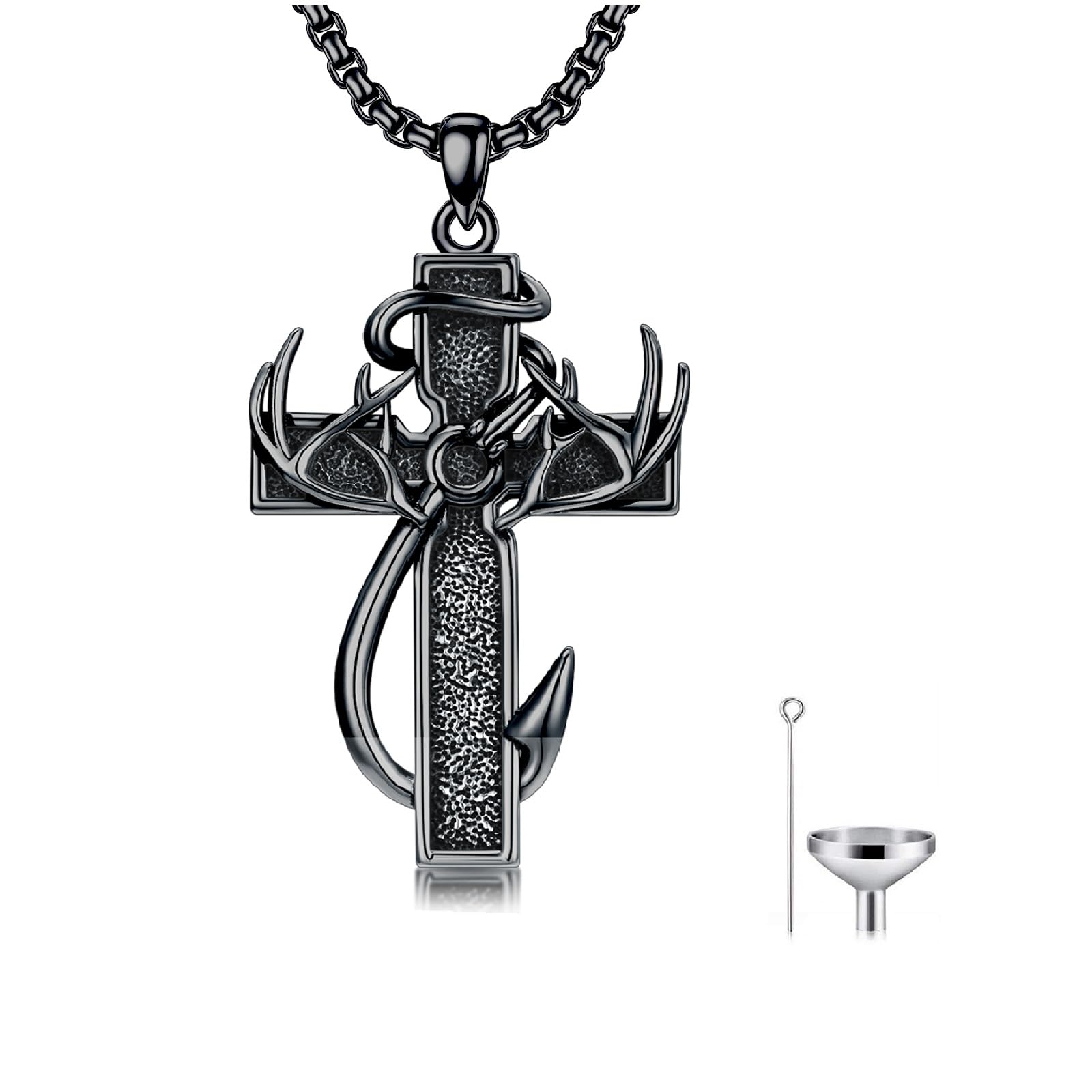Sterling Silver Deer Antler Fish Hook & Cross Urn Necklace for Ashes