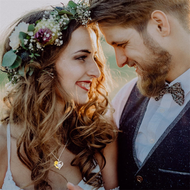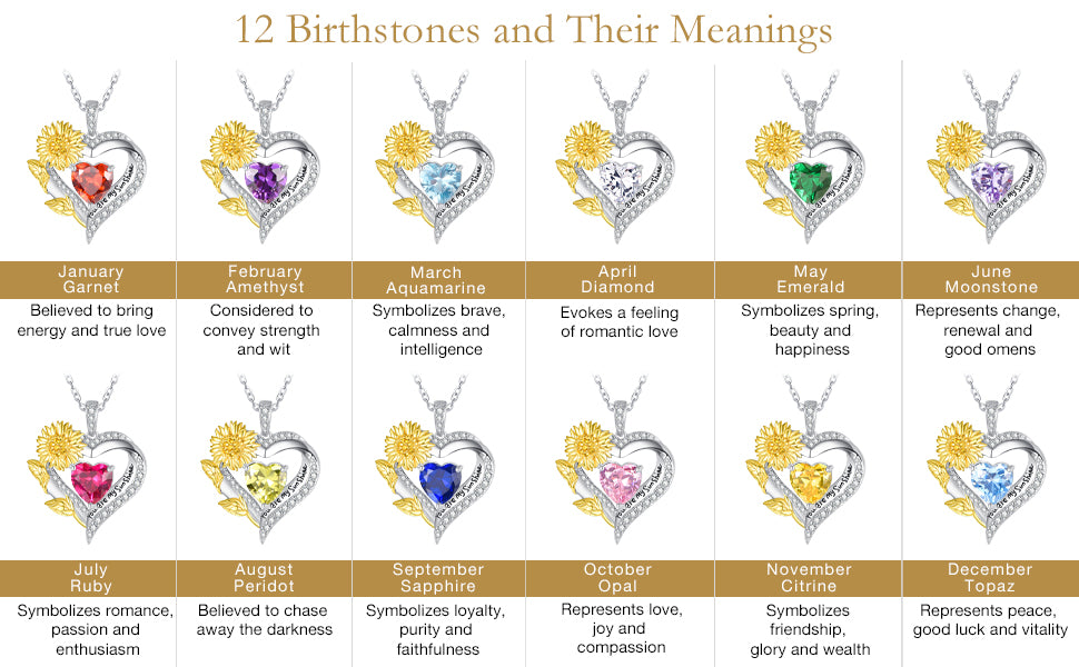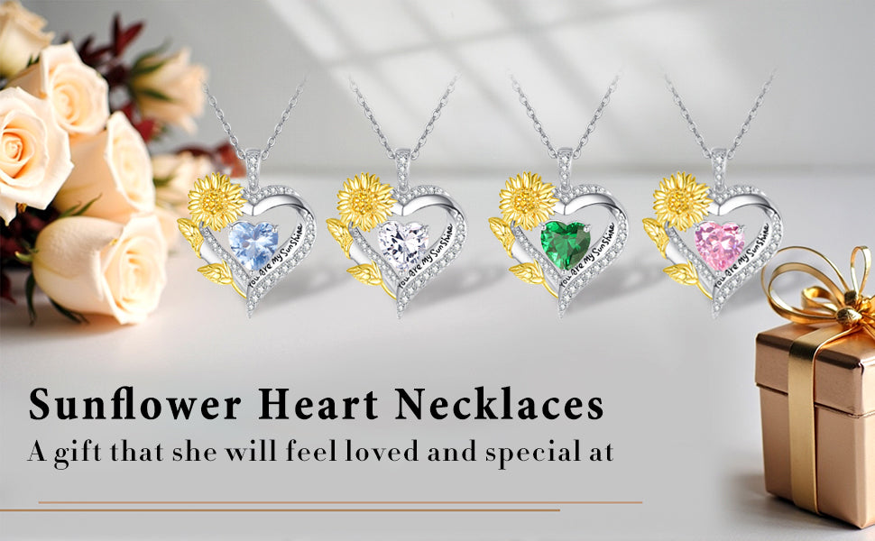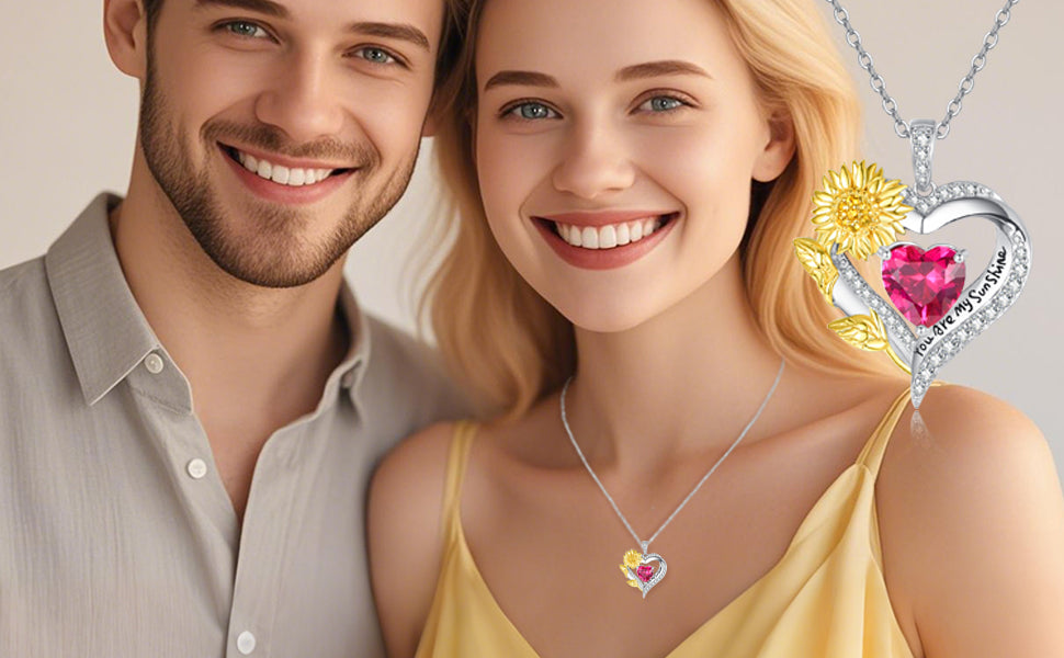 The double heart pendant engraved with the words "You are my sunshine" symbolizes "where there is sunshine, there are sunflowers. You are my sunshine, express your love and remind her to keep elegant and smile, it is the best sunshine gift. The double-heart design symbolizes love for each other, and no words are needed between the two hearts. The sunflower birthstone necklace makes your relationship closer and is a good choice to express your love for her on a special.